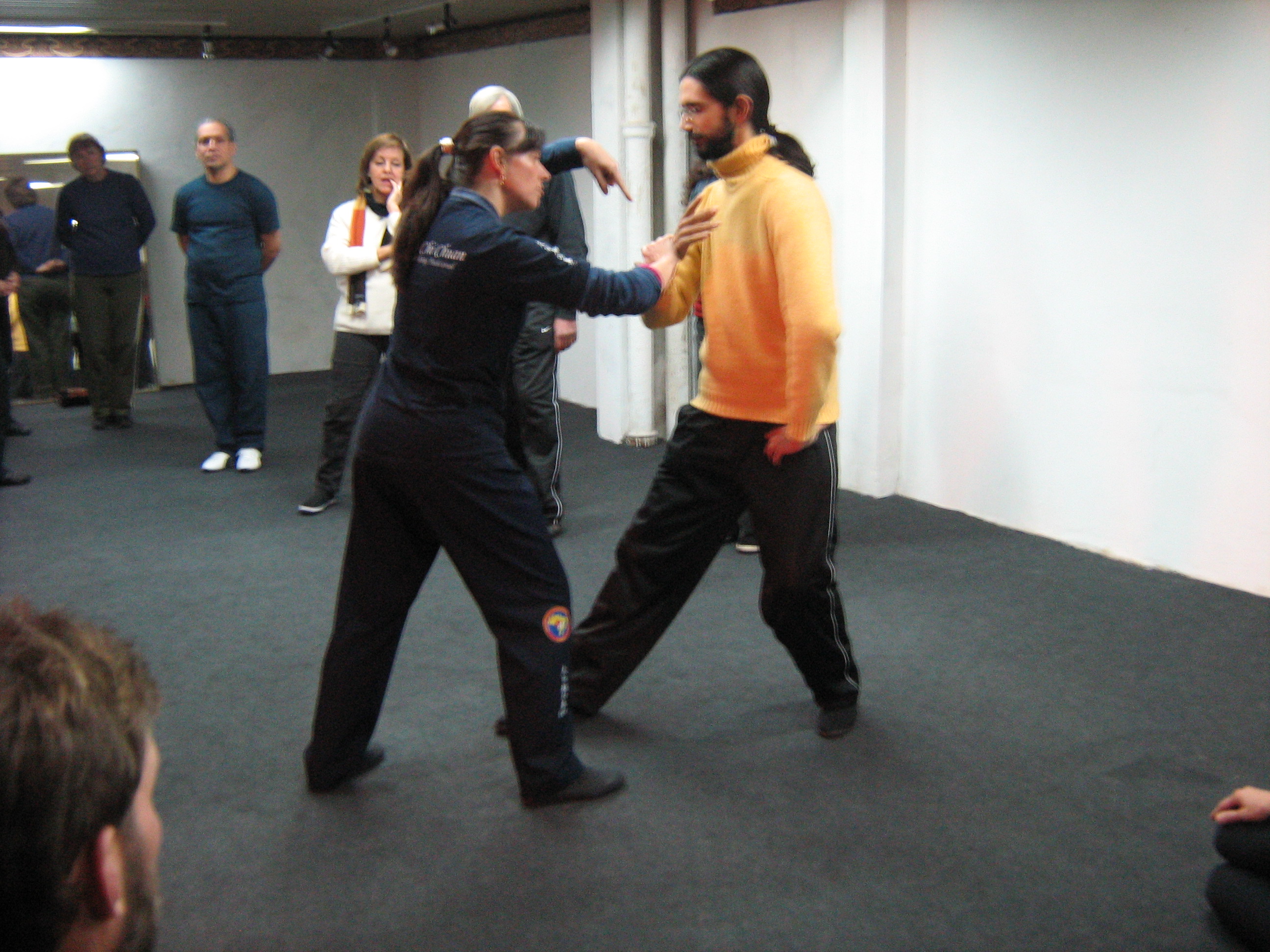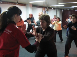 Volviendo otra vez a mi vivencia particular, fueron reveladoras sus indicaciones sobre cómo terminar mi empuje. Naturalmente a la defensiva, dadas mis características, al terminar mi empuje me tenso por el “ataque” que ahora se me viene con el empuje del otro. Cuando practiqué con ella volvió a decirme que al terminar el empuje hay que buscar conscientemente colocar la mano de forma de que se pueda completar el círculo. Fue increíble, buena parte del miedo de que me alcancen en el empuje, de sentirme vulnerable, no sé adónde fue a parar y la energía tantas veces puesta en defenderme pasó a buscar construir la dinámica del empuje y el desvío, a vivir la alternancia del yang y el yin.